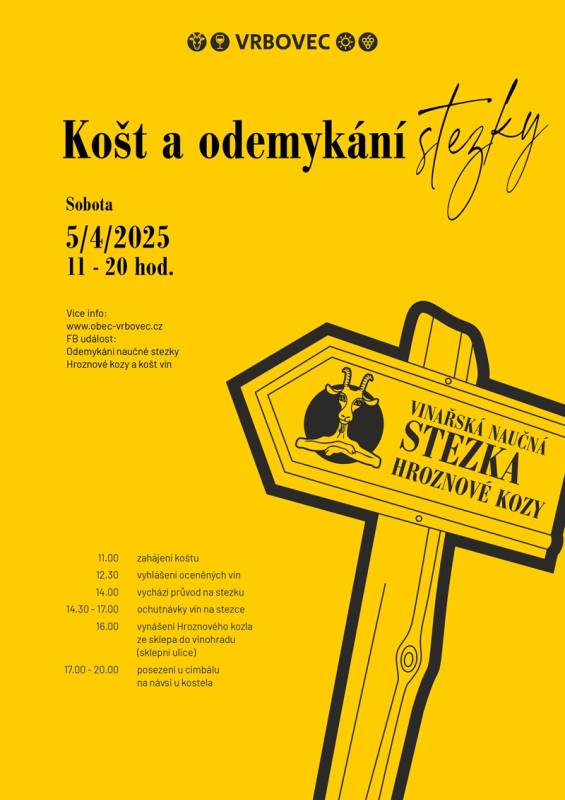 Odemykání naučné stezky Hroznové kozy ve Vrbovci spolu s vynášením Hroznového kozla do vinohradu je příležitostí projít si tuto 5 km dlouhou trasu, vedoucí vinicemi i sklepní uličkou Vrbovce, ve společnosti členů Spolku přátel Hroznové kozy, za zpěvu mužského pěveckého sboru, být svědkem ožívajících dávných tradic, ochutnat vína místních vinařů. U jednotlivých zastavení na trase naučné stezky bude od 14.30 do 17.00 hod. připravena ochutnávka vín některého z místních vinařství.
